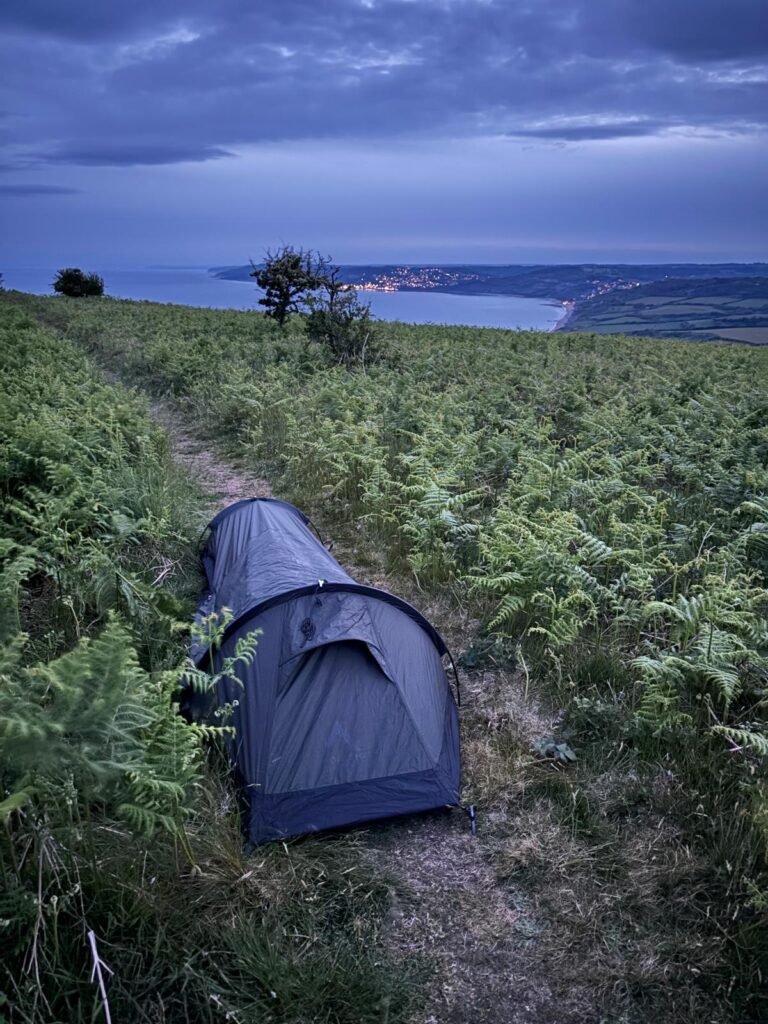 Another bivvy setup, on a narrow fern lined path, on top of Golden Cap in Dorset