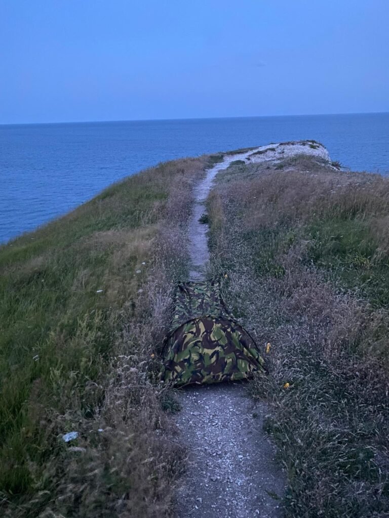 A bivi set up on a narrow footpath on Bat’s Head on Dorset’s Jurassic Coast