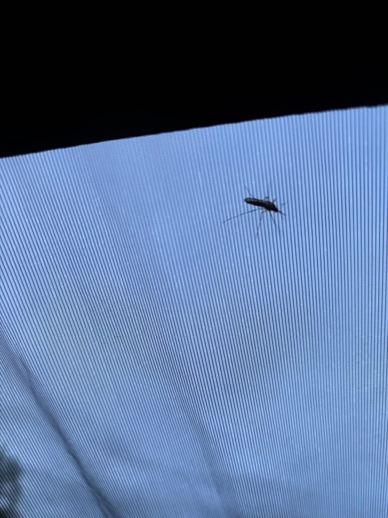 Looking up from the inside of the Nortent Skjul, with a mosquito resting on the bug net